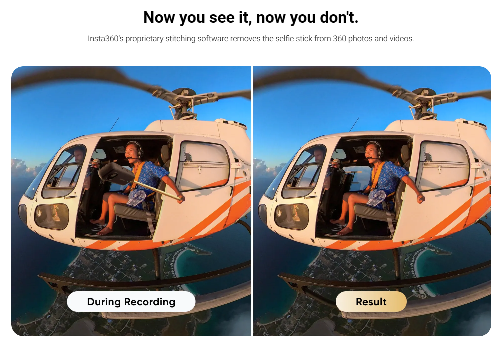 - Invisible Selfie Stick effect can only be achieved with 360 cameras.